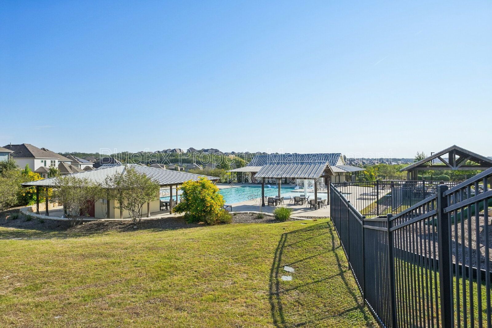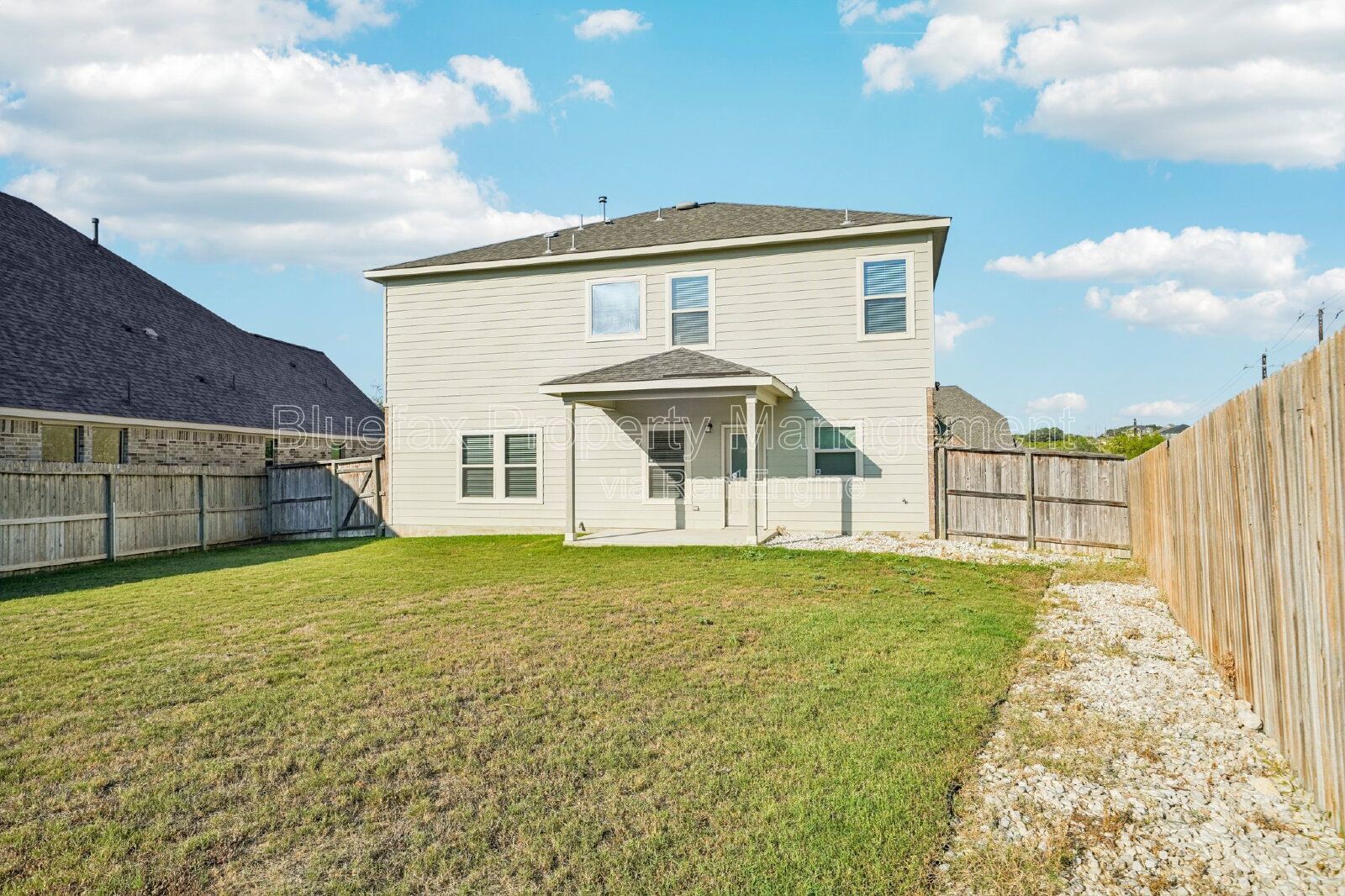 Covered patio out back with a deep back yard, privacy fencing and sprinkler system installed.
